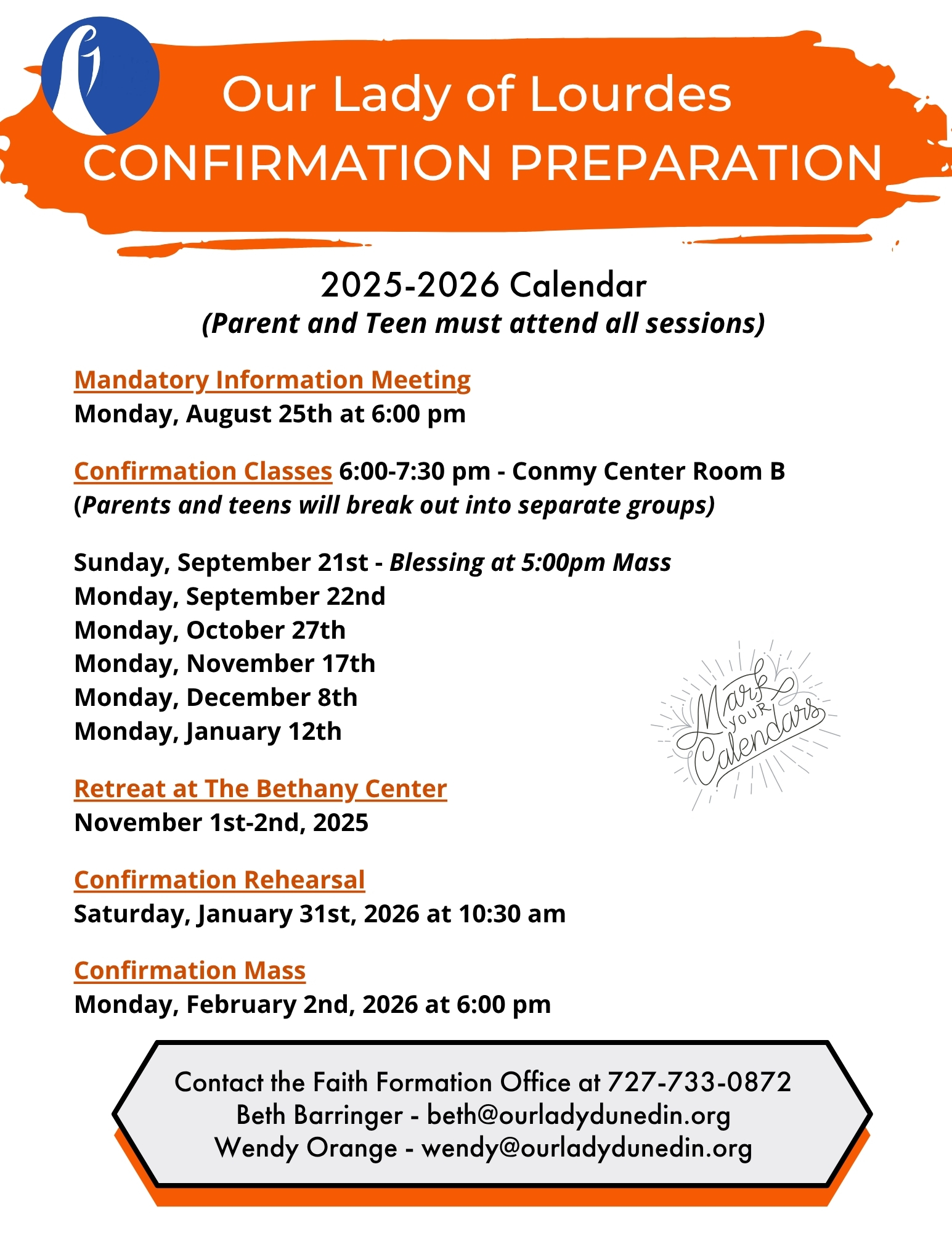 If you have any questions, email Beth Barringer at beth@ourladydunedin.org or call the Faith Formation office at (727) 733-0872.