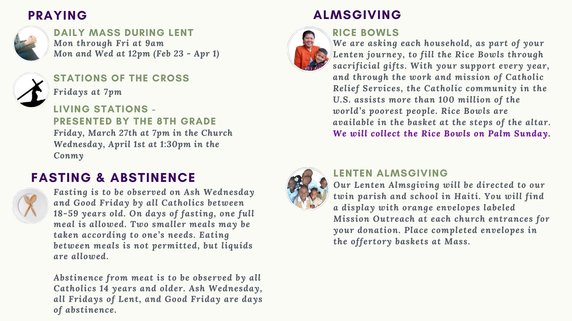 - Our Lenten Almsgiving will be directed to our twin parish and school in Haiti. You will find a display with envelopes for your donations.